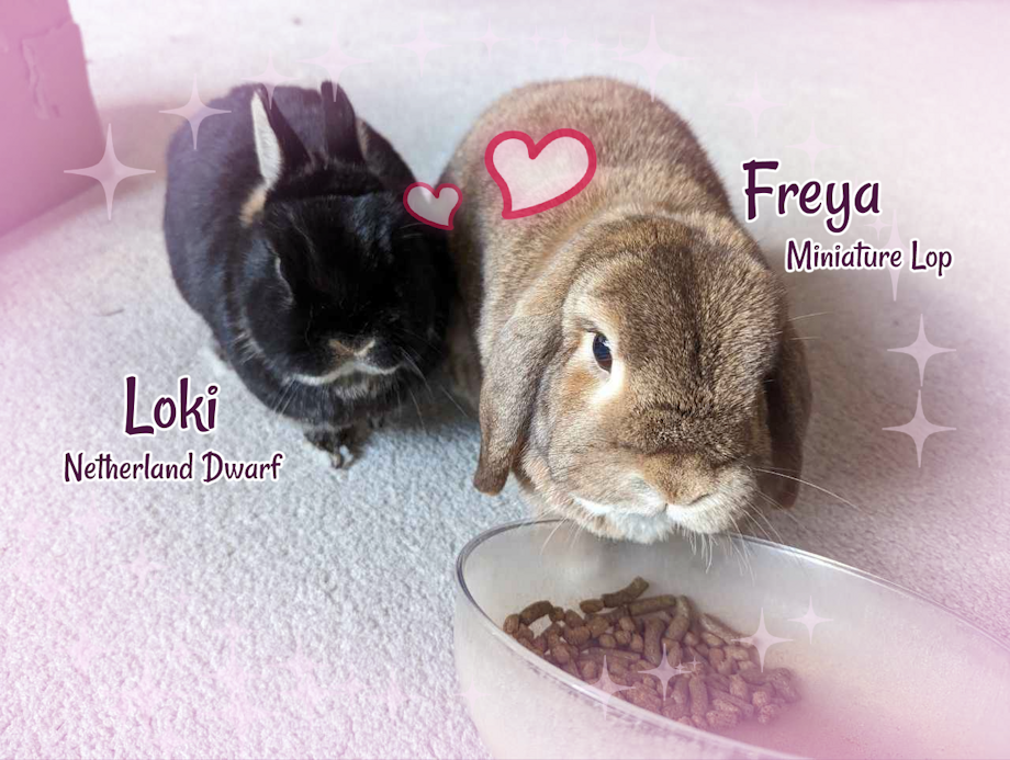 ---------- Details 2 female rabbits, bonded, both spayed and vaccinated. Loki is a black Netherland Dwarf, and Freya is a brown Miniature Lop.