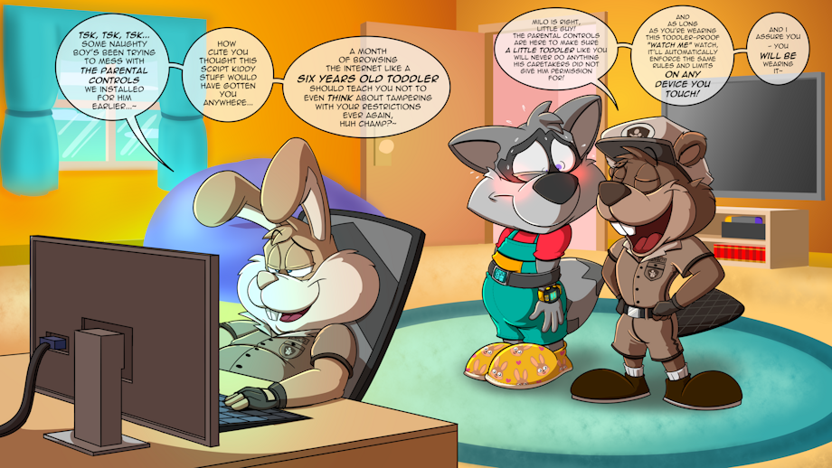 And if you think you could easily break out of a digital playpen like that because you're "good with computers", then better think again! Tupi was confident with his programmer skills he'd get rid of all the nonsense limits and restrictions in a blink of an eye. Unfortunately for him, the only result of running his script was an instant come back of Milo and Barrett who are now making sure the "little toddler" will never even think about messing with his parental controls ever again!