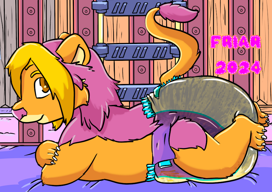 Illustration of Friar the wet and messy diapered lion flopped on his tummy in the crib as seen from the side where he is smiling at the viewer.