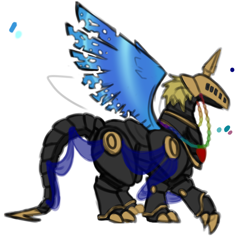 No one expected Gleam to go from the smallest member of party to the largest, but she did, evolving through the power of the Digivice to become BlackMaildramon. Legally and morally distinct from DarkMaildramon. A gentle stalwart with a twisted tongue, she speaks either not at all or in flowery, elegant prose with no in-between, weilding Desdemona fire from the golden stinger at the end of a powerful black tail...