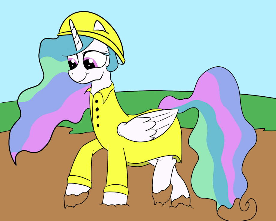 Princess Celestia walking in mud in yellow raincoat