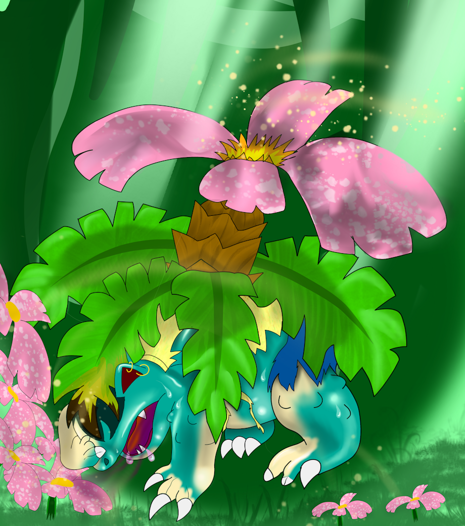 Ean went into the forest to explore an nearly alien area, as he spotted some pink flowers,  he decided to take a closer look as he suddenly felt weird, overwhelmed by smells his body start to grow slimy scales replaced his ones human skin and his shirt ripped open. A big bump started to develop on his back, leaves covered his back as a majestic flower grew wide and pretty, he could feel everything the leaves taking in sun energy to fuel his now enormous body the flower moving with his body movement and wind. And the same pollen now polluting the entire area around him, the fromer Human wandered deeper into the jungle to helps the flowers grow and spread even further. As a Venusaur.