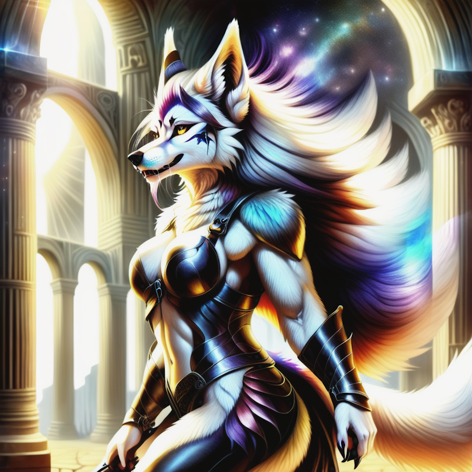 A powerful, white-furred wolf warrior in black armor stands proudly in front of a crumbling ancient ruin. Her bright yellow eyes gaze intensely at the viewer, while her flowing hair glitters with stardust. The sun shines warmly through the arches of the ruined building.