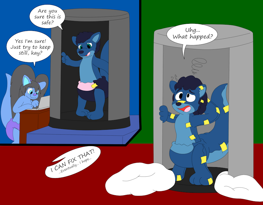 Oh well, it's a good thing his girlfriend is a super genius, she can have him back to normal eventually, but then again, why the rush? This is a rare opportunity to to do some tests on her new crinkly boyfriend. Not everyday you get to study a diaper critter, especially a fur turned diaper critter.