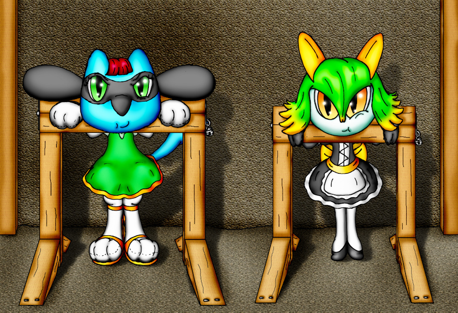 Letting her followers vote on what to do next, Amelia agreed to have herself locked into one of the pillories and set the camera up on a portable tripod so her viewers could gawk at her as she played the role of a misbehaving "worker." Goldie soon got roped into joining in the little "challenge" too, leaving the two stuck for at least the next couple hours while Amelia's ratings skyrocketed.