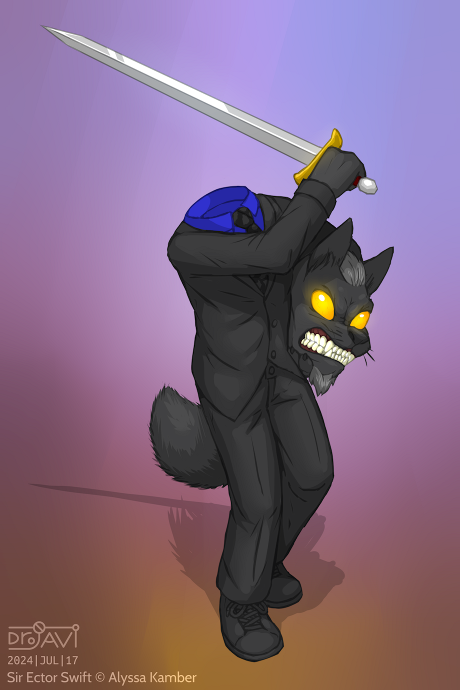 See my gallery for Hector's information. In short, he was a knight who was beheaded in the 1200s, and is now head-of-staff at a large house.There's a local legend that treasure is buried on the grounds. This is Hector when someone decides to hop a fence and dig at 2 AM. He throws on some clothes (hence the more casual lace-up shoes) and goes out to make them go away.