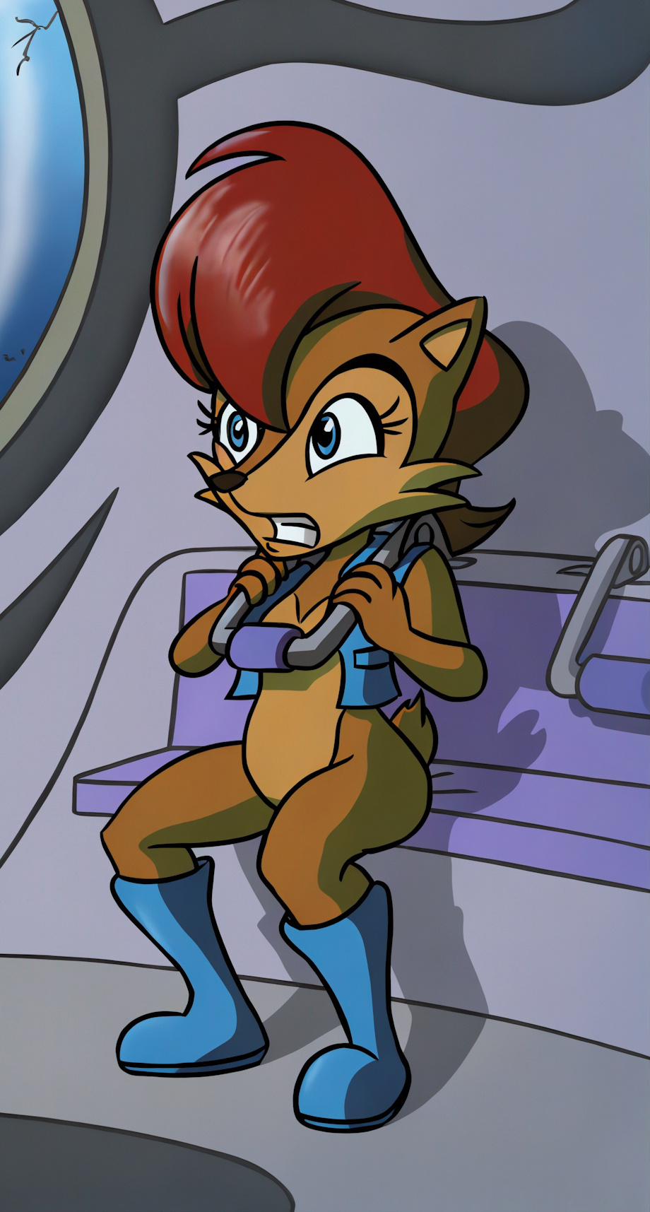 "One Day, Sally Acorn Was Exploring An Abansdoned Space Ship When She Found A Esacpe Seat, With The Over The Shoulder Restraints Open,