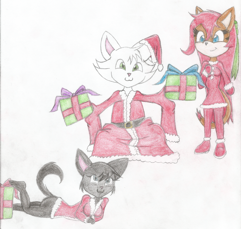 This is a picture I drew of me Chris the Kitty and my girl Shade the Kitty Cat and my friend every ones favorite Ketty Molly Ketty celebrating Christmas,I hope you like it. Hehe =3