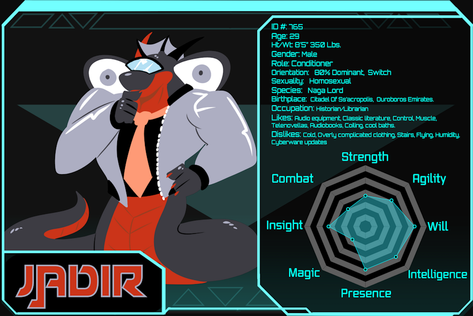 Jadir Cri'tozan was introduced to Darkwitt 10 years ago shortly after he came of age. Many of the employment opportunities presented to nags are heavily regulated; positions with any kind of authority are severely frowned upon, and business owners require significant oversight. Jadir found the restrictions difficult to navigate, Initially he committed to college for anthropological study to delay his employment opportunities until he could better find a direction. By the time he nearly earned his degree, Darkwitt had been scouting the college grounds specifically for nagas. Darkwitt took interest in Jadir when he discovered the naga had found a loophole in their leadership embargo: None of the people who were ensnared by Jadir's influence worshipped or submitted to him. Instead, psychological anaylsis reported all of his friends had significant personality and identity changes upon meeting him. Jadir was not enslaving them, but he controlled nearly everything else to play characters he would invent. Their grades and productivity weren't affected, but it did lead to some friction amidst a few activist groups that called for his expulsion. He was not breaking the law, nor was it enough for naga advocacy groups to concede a violation had occurred. But he was quickly ostracized at his school.