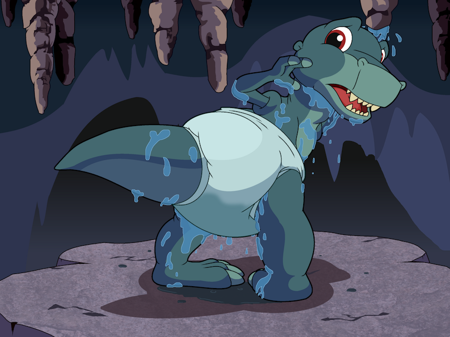 It seems like Chomper is trying to stop the stalagmites in his cave from leaking by blocking it with his hand, although this only seems to cause water to flow all over his body, and, into his diaper instead!