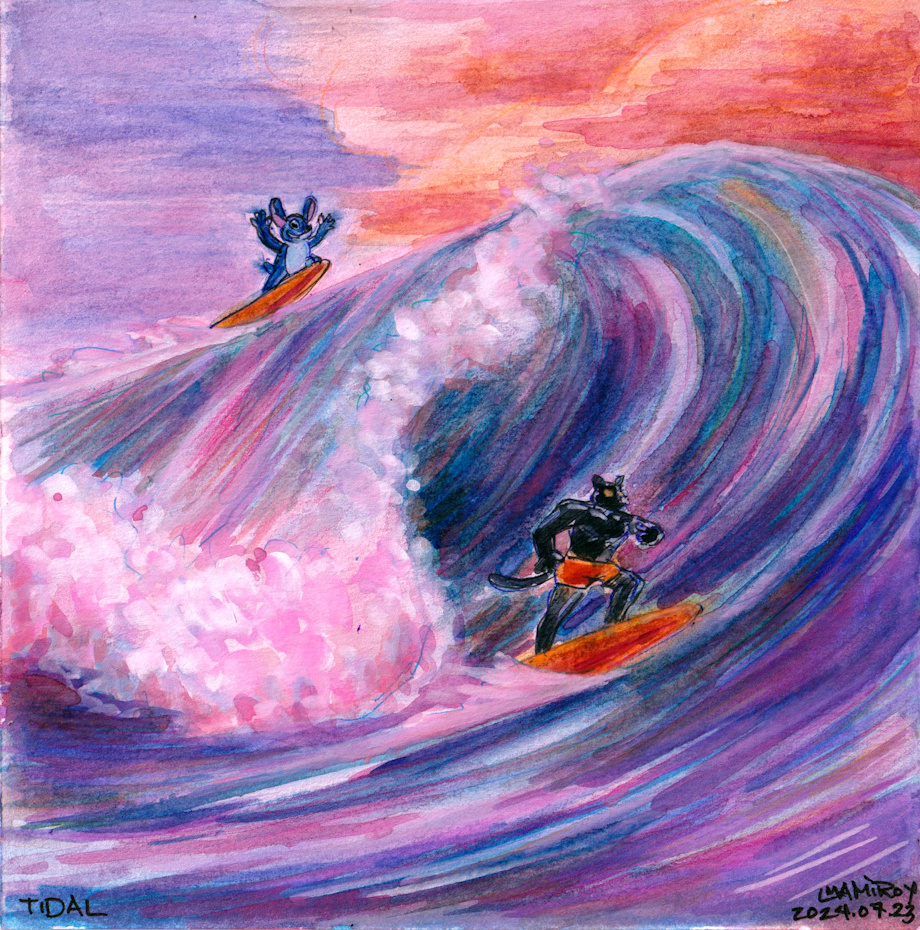That's Stitch, and he has overcome his fear of water, at least in this painting.