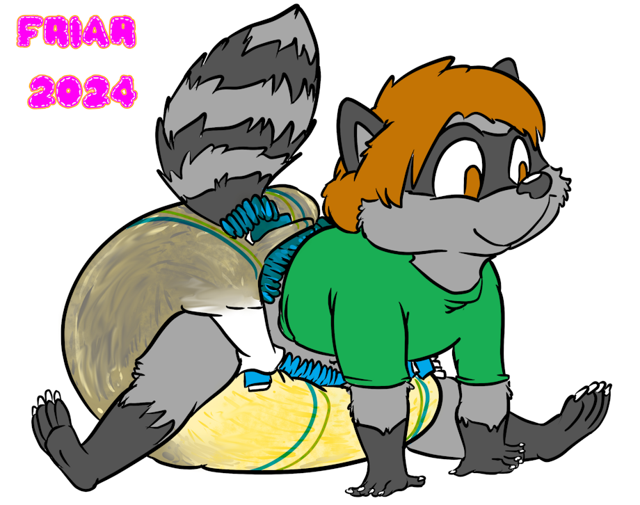 Illustration of Tylahn the wet and messy diapered raccoon flopped on the floor next to Friar's crib in a very large diaper.