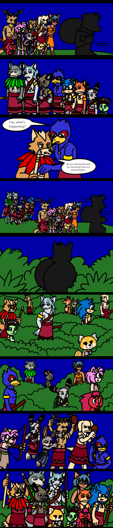 This pic is a collab I made with my friend sirinathehedgehog This is a comic that came to mind based on an idea I had for a fic from another fandom where it would show what it would be like if the characters of a fandom x lived in a tribal environment. Also, this is a crossover comic between Sonic The Hedgehog, Star Fox, Happy Tree Friends, Zootopia, Aggretsuko, Beastars, and BNA Brand New Animal. Although there are other fandoms included here. This is the twenty eight page.