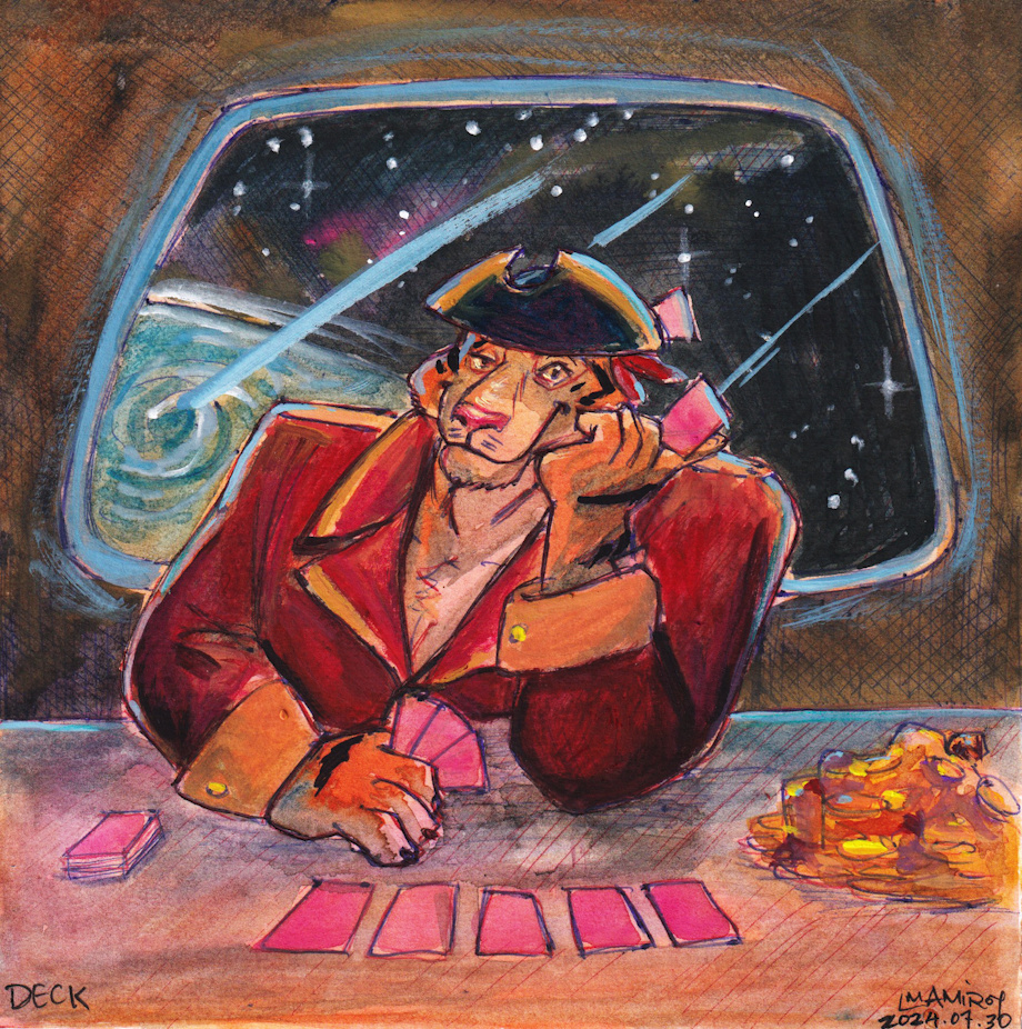 A belated International Tiger Day piece, with the Tiger Space Pirate Captain having a few wild cards up his sleeves as he plays poker with his crewmates.