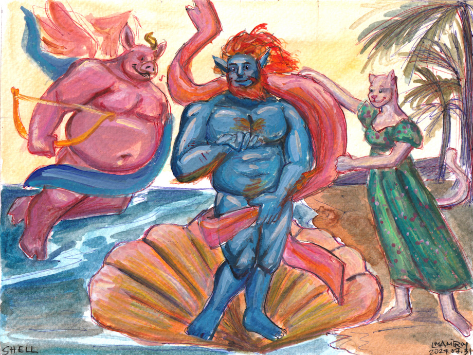 Slightly wider resolution to conclude this year's World Watercolor Month, with a classical art homage presenting Simon the Merman a la Botticelli.