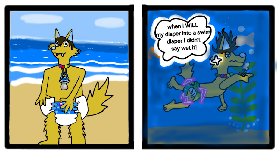 He WILL his regular diaper into a swim diaper he accidently wet it. Been a swim diaper and been wet his subconscious mind accidently WILL it too be wet.