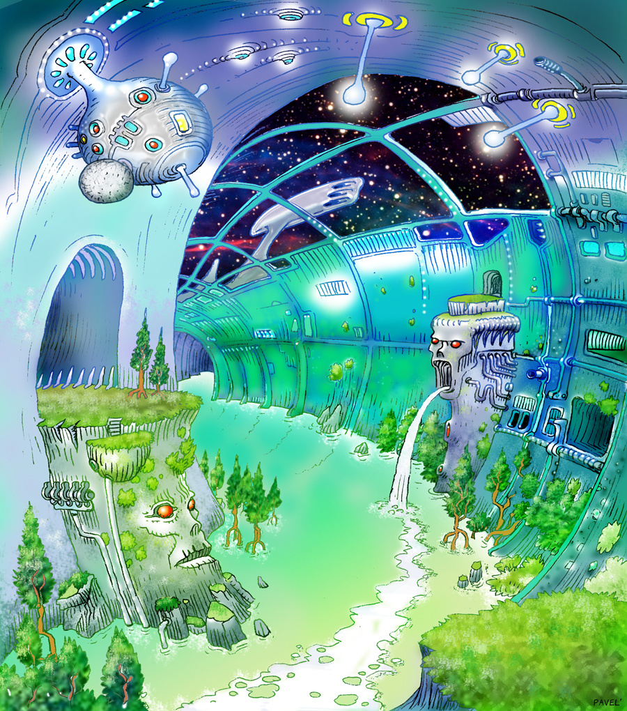 WOW O_O been a long time since I have seen something like this. Reminds me allot of my uncles art style, less realism more toonish but tones of awesome surealness. It's alot like some awesome prog album cover.