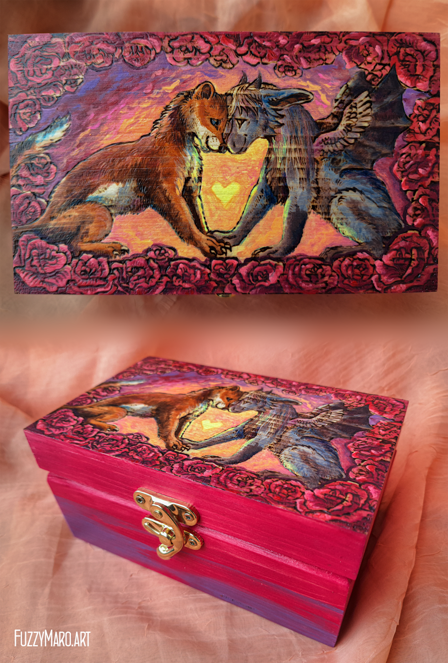 This wooden box tells a love story with a unique technique. Burned details and a splash of acrylic paint create a rosy love story on this wooden box! I felt like daydreaming while creating this one!