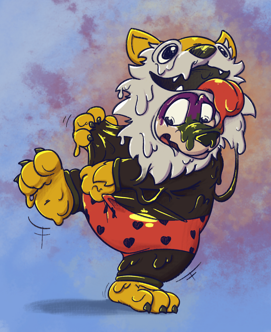 Looks like Blum has been playing too much Fall Guys! He put on the undies of Undiegold the Wolfbean (my Fall Guys OC) and immediately regrets his choice. >:3