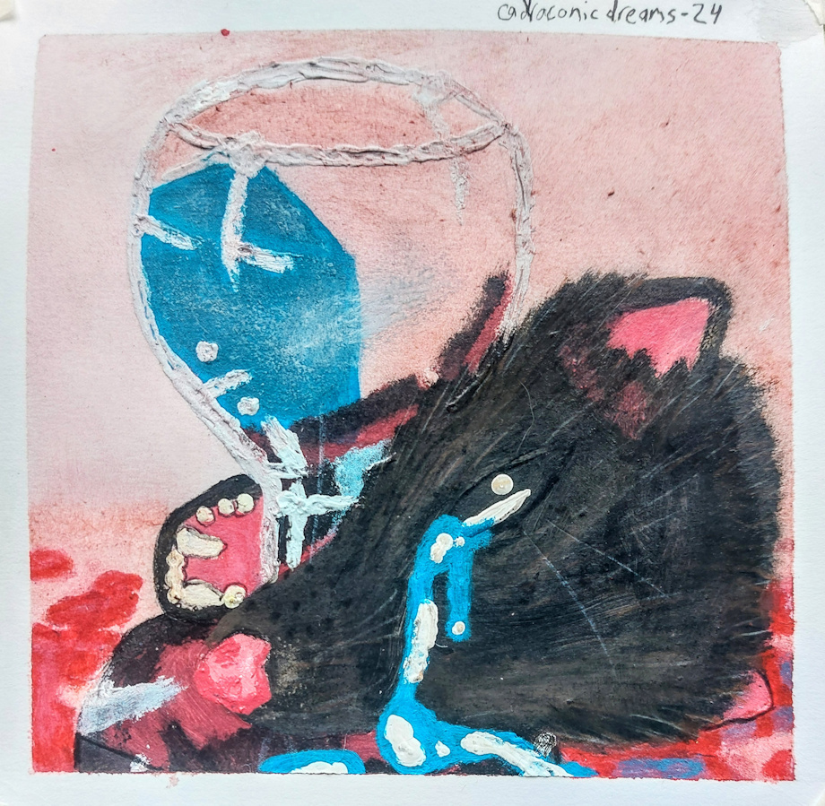 I've been really depressed since my ex cut off all contact... so I've been trying to stay distracted... this is inspired by a random meme I found online - I completely re-envisioned everything, creating this abstract / surrealist inspired piece. I played around with some fun techniques here; what do you think? $90 PayPal OBO, shipping and lamination included (comes with tracking number.) Approx 5 x 5 in. on mixed media paper, acrylics, oil pastels, (watercolor) colored pencils, watercolor, varnished with workable fixative.