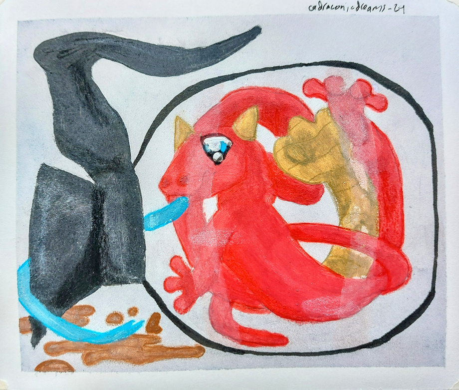 I've hesitated sharing this completed illustration these past few days, if only for the fact that I haven't been feeling well mentally... but I hope you guys enjoy this anyways, a piece that was originally inspired by a Furcadia friend (unfortunately I forget who, comment if it's you pls) during a casual convo - somehow the the silly idea of a creature inside a coffee pot, sad because it's empty came up and it evolved from there into the above scene... thanks for looking. If you buy, you'll technically be purchasing both the artwork and this drake's adorable design! $100 OBO (comment or note to claim, US shipping with tracking along with lamination is included!) Approx. 5 x 6 in. on mixed media paper, acrylics, watercolor, colored pencil, archival (brush) ink pen, oil pastels, varnished with workable fixative.