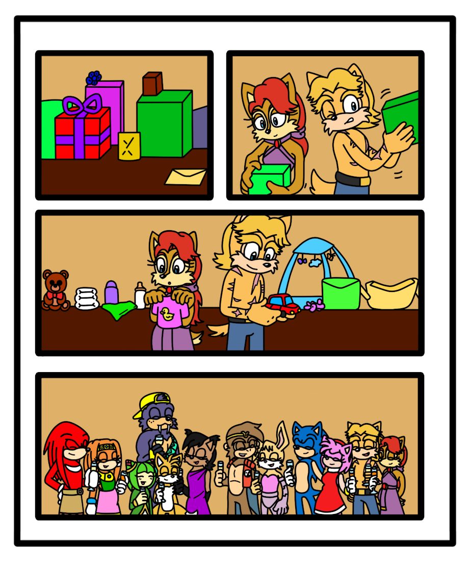 Continuing with the baby shower, Antoine and Sally open the gifts that their friends (Sonic, Amy, Tails, Cosmo, Knuckles, Tikal, Rotor, Nicole, Bunnie and Monkey Khan) gave them for their children. After that, everyone toasts to the children being born in good health.
