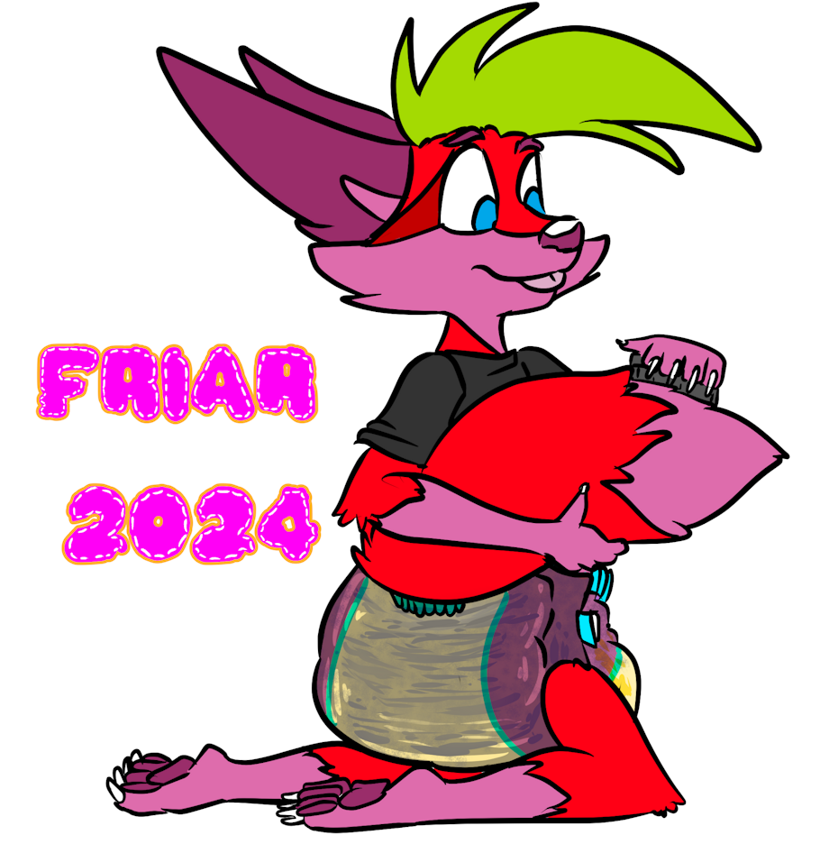 Illustration of Berry the wet and messy diapered fox brushing his tail on his bed next to his Wyldfyre body pillow.