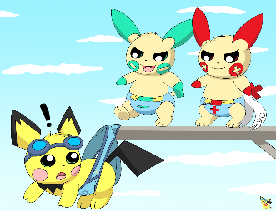 Poor Sparks had a mishap with his briefs while attempting a dive, now the shiny plusle and minun want to make it worse X3