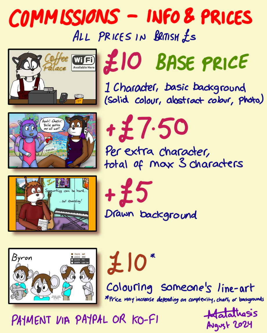 I've also got a couple of open YCH pieces which you can chose to have instead - and when I do a YCH, it's usually re-drawn to a certain extent, so don't necessarily take what the shown completed images look like as a proper reflection!