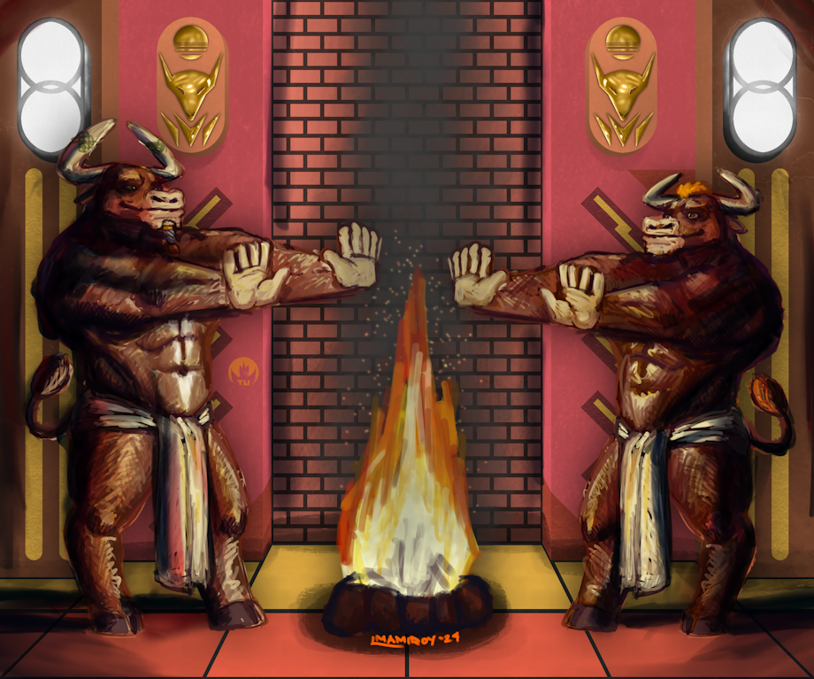 , where my character Taurus and his character Shernard warm up for a Greek-style bonfire ritual.