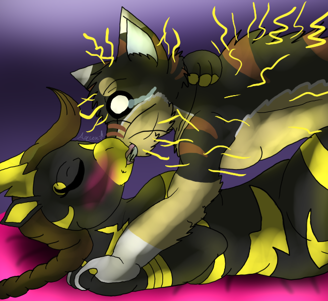 His OC Margaret Johanson the Zebstrika morph making out with Courtney's genderbent Corbin witch turns out to be "electrifying", he's regretting making out with her now. :'D My last submission til sometime next week.