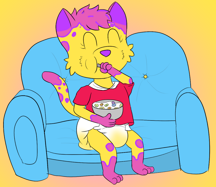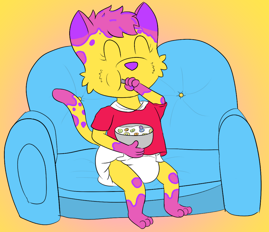 Fifi sitting on the couch enjoying a bowl of froot loops cereal