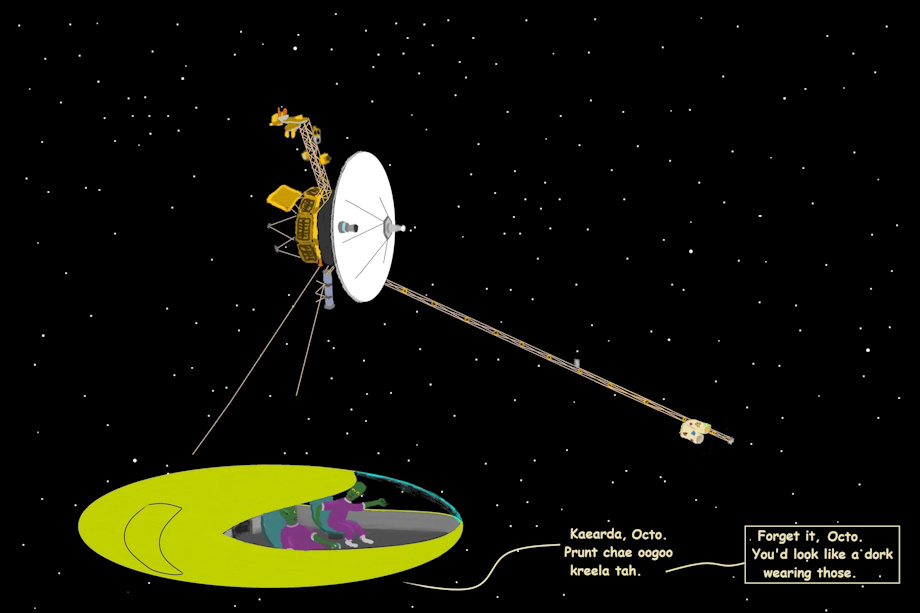 Two extraterrestrial beings were returning home from an exploration mission when they encountered a strange craft. They don't know where the craft came from. Though they did see a strange garment attached to a long boom extending from the craft. Octo wanted to dawn on a space suit long enough to go out and fetch the strange garment. Aggoath told Octo to forget about the strange garment, informing him that wearing it would look dorky. Aggoath and Octo had no idea the garment was a pair of underwear. They thought it was a decorative garment meant to be worn on the outside of other clothing.
