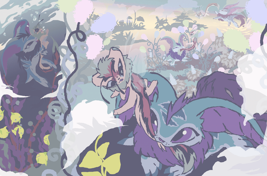 both live in a marsh environment. the cybunny is a bit stupid and puppy like... she adores the xweetok as a 'toy' and loves to play with her! but sometimes that play involves tormenting, nearly drowning, chewing on, etc... the xwee is helpless to avoid it, and eventually comes to enjoy it..