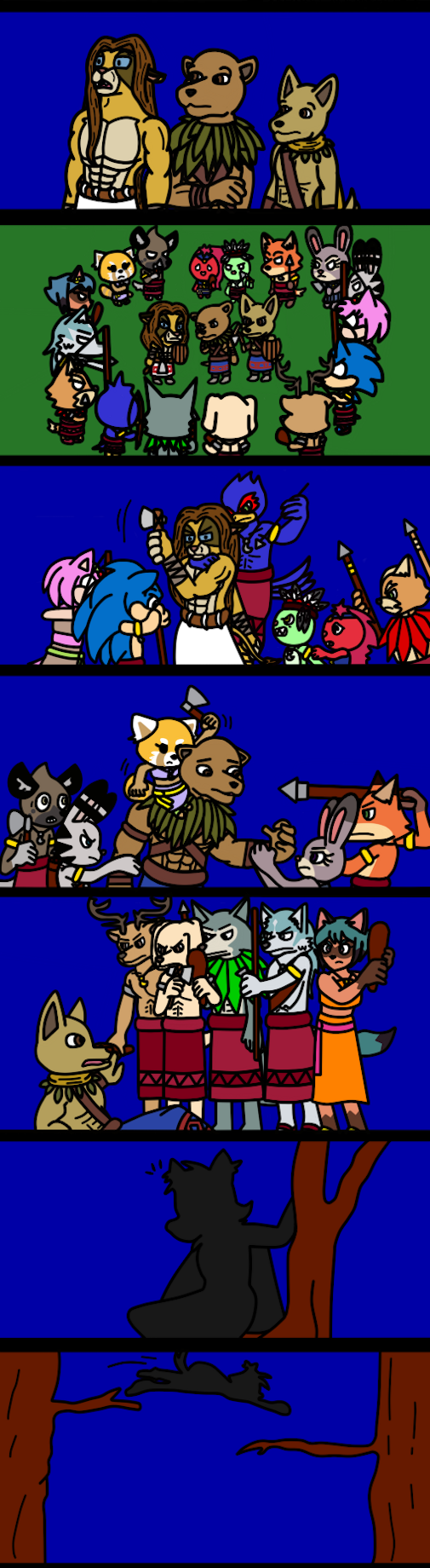 This pic is a collab I made with my friend sirinathehedgehog. This is a comic that came to mind based on an idea I had for a fic from another fandom where it would show what it would be like if the characters of a fandom x lived in a tribal environment. Also, this is a crossover comic between Sonic The Hedgehog, Star Fox, Happy Tree Friends, Zootopia, Aggretsuko, Beastars, and BNA Brand New Animal. Although there are other fandoms included here. This is the twenty nine page.