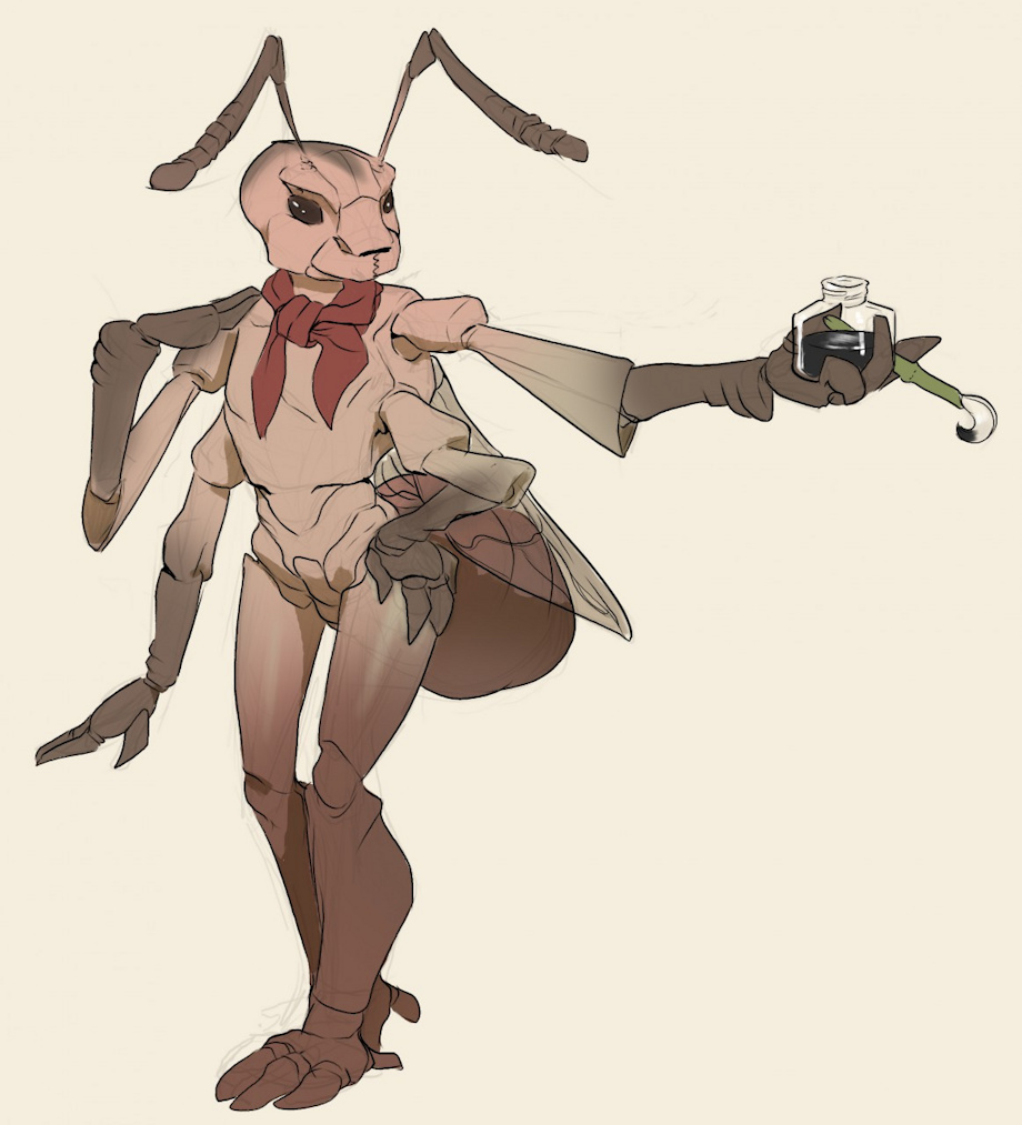 I've wanted to get a bugsona pic for a while, and I reckon ants are the most fitting species choice for me. So here's a male ant (hence the wings). I reckon in his ant-y society the males aren't quite as hapless as their real-life counterparts, but get given less physical duties since they're not as strong and sturdy as the worker gals. Thus he has some training as a scribe, using his brush and ink for important (if unglamorous) admin duties. Also handy to have a skill, because it's standard practice to send groups of males as diplomatic gifts, much to the puzzlement of other species who may not know quite what to do with 'em.