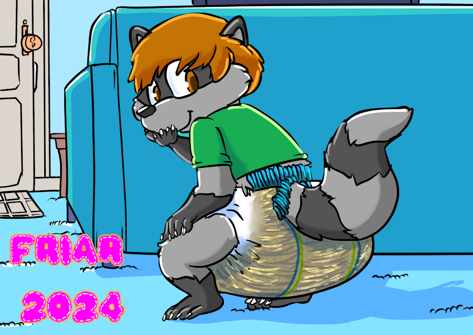 Illustration of Friar the wet and messy diapered lion flopped on his tummy in his crib.