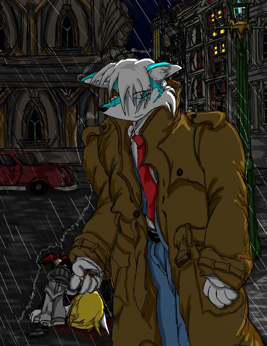 A car pulled up through the onset of the storm, the distance of fifty or so feet from where the dog stood. The cherry red veneer of the cars paint job had shown darkly against the veiled light of an overhead street lamp, but the look was distinctive enough. It was her.. Mira.. She stepped out of the open car door with that swaggering strut, the gentle sway of curvaceous hips behind a thick black rain coat. Golden blonde hair hung long past the shoulders, a beautiful face matching the effeminate beauty of her form. Past the living splendor of their meet, in the back of the dogs mind, something felt off. Perhaps it was the slip of her tongue over the telephone, the ever so slight change in her tone, or the exposed location she had chosen as their meeting place. But something left him on edge; perhaps she was followed after all..