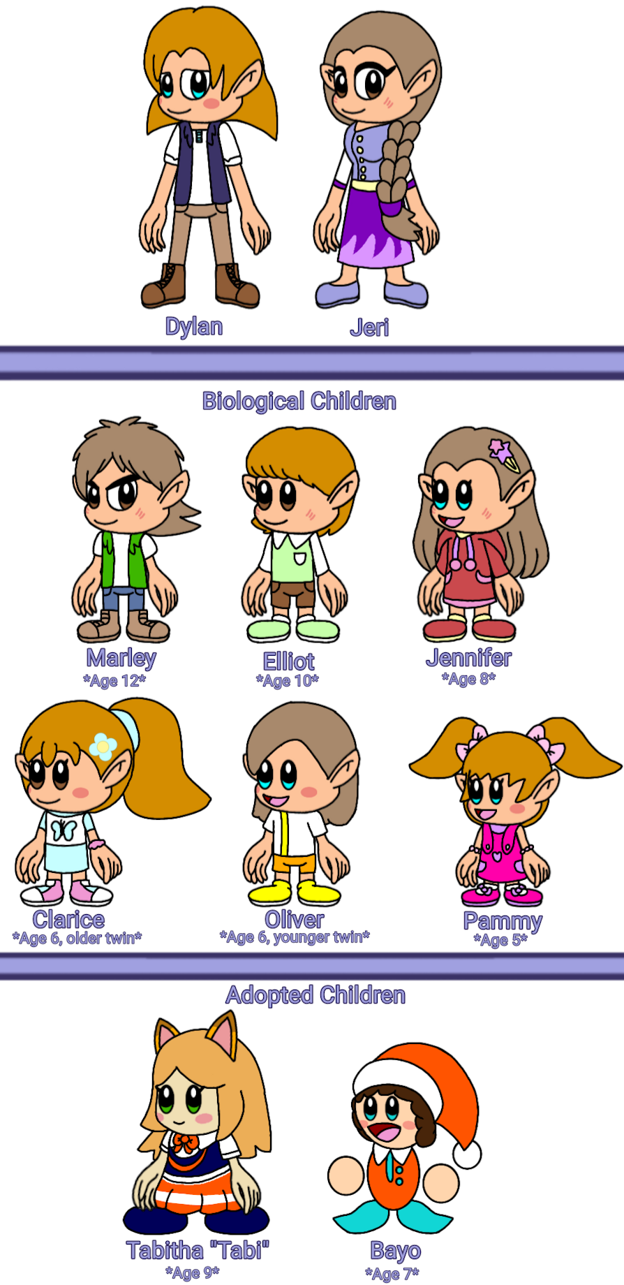 Marian bids farewell to Dylan and Jeri as she heads back home, hoping to see them one day. --- Married and beginning of Parenthood: 10 years later Dylan and Jeri got married as they opened up a market together alongside their parents and the latter's grandmother. 4 years later, they have their first son Marley, two years later, they have Elliot, and another two years later, they have Jennifer. --- Tabi's adoption: Tabi the daughter of a pair of skillful Keke sorcerers Clarice and Oliver, who were in bad steps with Nightmare. At 3 years old, Tabi witnessed her parents being killed by a pack of Wolfwraths sent by Nightmare, leaving her an orphan as well as PTSD at such a young age.