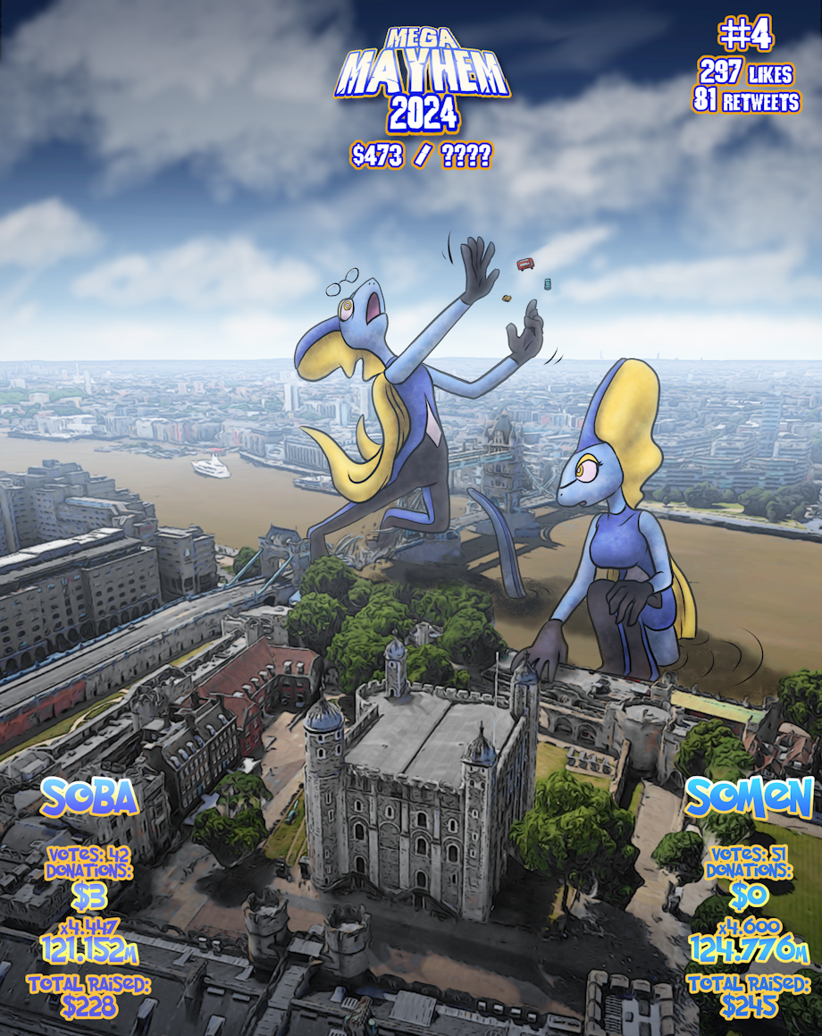 Page #04 of this year's Mega March Mayhem 2024, featuring Sojiro's Inteleons, Soba and Somen! Looks like they're getting around London well enough, but... whoops! Better be careful next time!