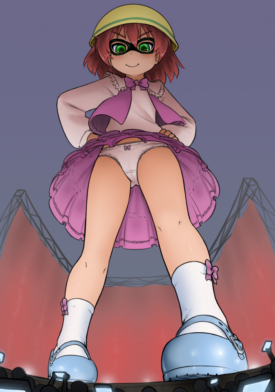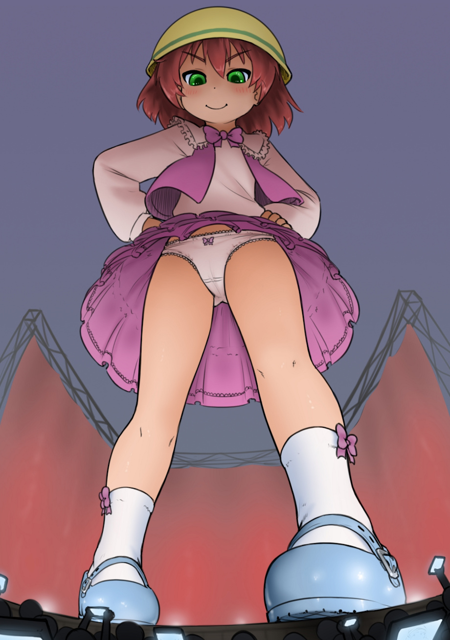 Now that's a great viewpoint right there! Cute and proud Aiko standing tall on stage! Cute pink cosplay choice and everything, I like the skirt hangs (and the pantsu they provide)! Quality looming overall with the under-lighting and all that, adorable shoe perspective too. Not to mention the excellent smug expression overhead!