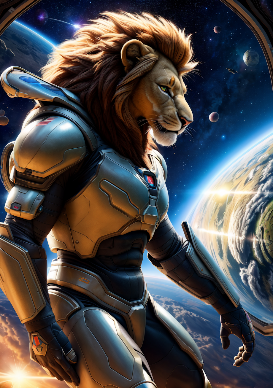 artwork (Highest Quality, 4k, masterpiece, Amazing Details:1.1) SCifi setting, lion, adult, photo realism, soldier, scifi armor, space, intense battle in background,hyper realism, RAW photo, (realism, photorealistic:1.3), detailed, hi res,