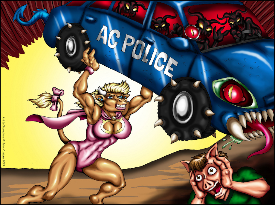 Much like the last piece of Saurus the alligator defending his job from demons Taurus the super powered bovine is also doing her part taking on a demonically transformed police car.