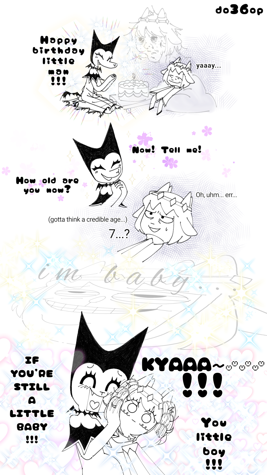 Doodle of a scenario I had in mind with these two idiots. All-Father usually disguises as a young boy to cope with his fuck old age, High Mother is High Mother and just treats him like a kid, enabling him without knowing He hates the concepts of birthdays.