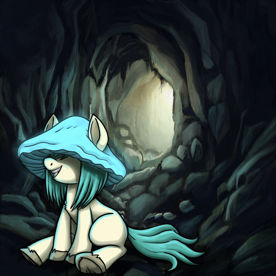 I only played Second Life once so I am probably not your friend. I have seen one other image of a mushroom pony where the cap covered the eyes, so it's not entirely original, though this interpretation came from a friend who probably likes an OC with that kind of hairstyle.