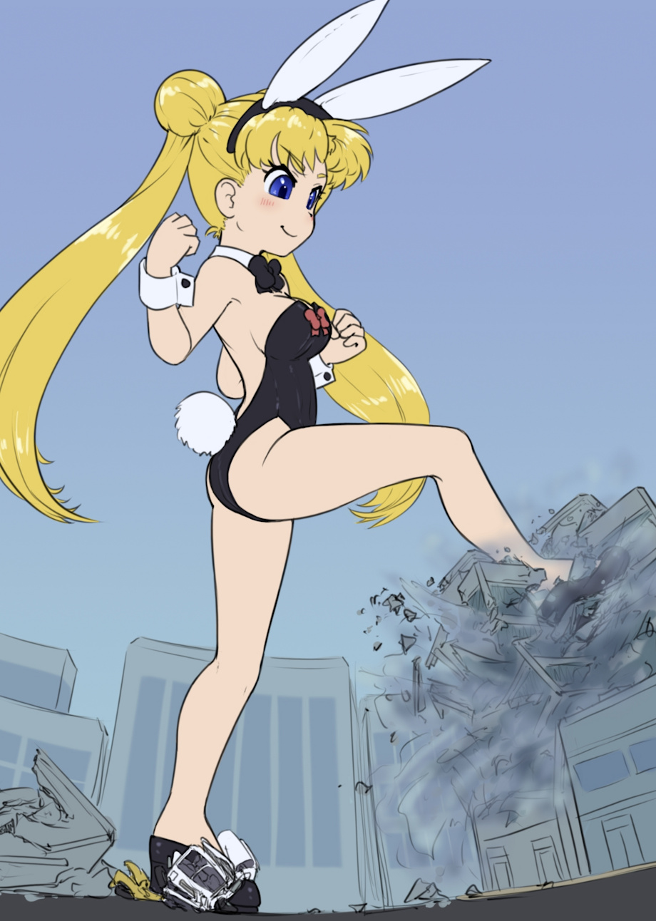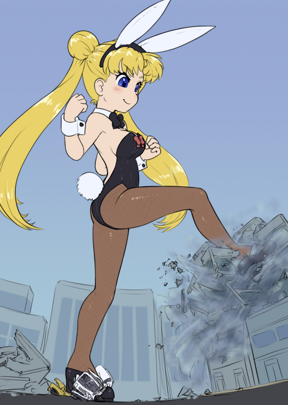 Usagi's coming through! With a name like that it's only natural she'd wind up in such an outfit, hahah. And she certainly seems happy with it, too! Adorably mean expression as she makes quick work of the city, nice legginess from the outfit and pose! I like that facial viewing angle, it's not used often but it's always cute when it is! The proud positioning of her pumped arms helps sell how into the stomping she is too. She got a two for one deal underneath her high heel after all, no wonder she's full of zeal!