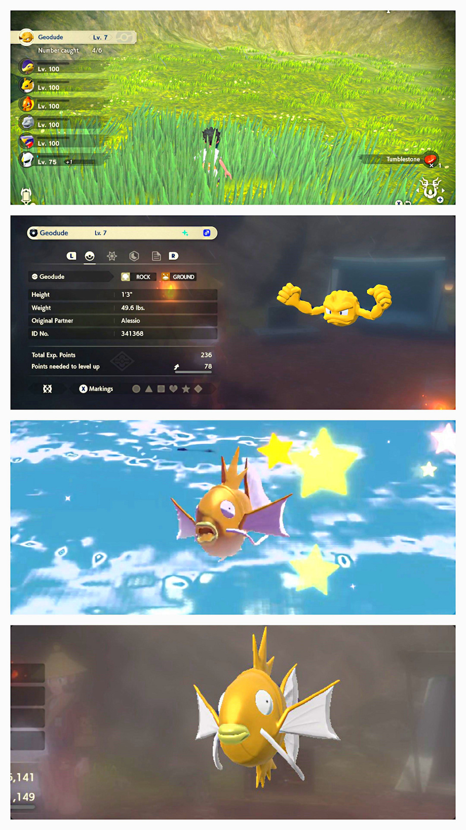 hey guys!!! So this is also you can call a birthday present I got for my birthday Sunday afternoon XDX3 okay So what happened exactly before my birthday I ordered this new game called F.E.AR. For the PS3 but It just arrived today on Tuesday so in the meantime last weekend I had nothing else to do besides celebrating my birthday So I thought why do not some shiny hunting on Pokemon Legend of Arceus so I was trying to hunt specific pokemon but while I was on my way to an outbreak I came across a shiny geodude again it's like my 5th one in my entire pokemon game history????????? Where the fuck do they come from is somebody spray painting them or something XDX3 so anyway I have to be honest magikarp was also a shiny pokemon I would really want on my list and by a lot of luck I caught one so it was also right on my birthday so you can consider it also a birthday present from Pokemon one of the best shiny Pokemon you can catch