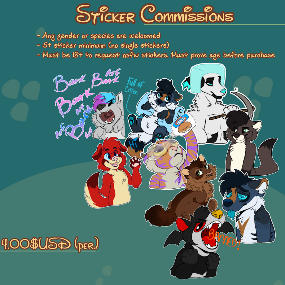 Open for sticker commissions! These are 512x512 px stickers compatible with discord and telegram!Be sure to read my TOS (https://waterdogdraws.carrd.co/#tos) before commissioning me! Feel free to comment below or reach out to me via Telegram, Email or Discord!