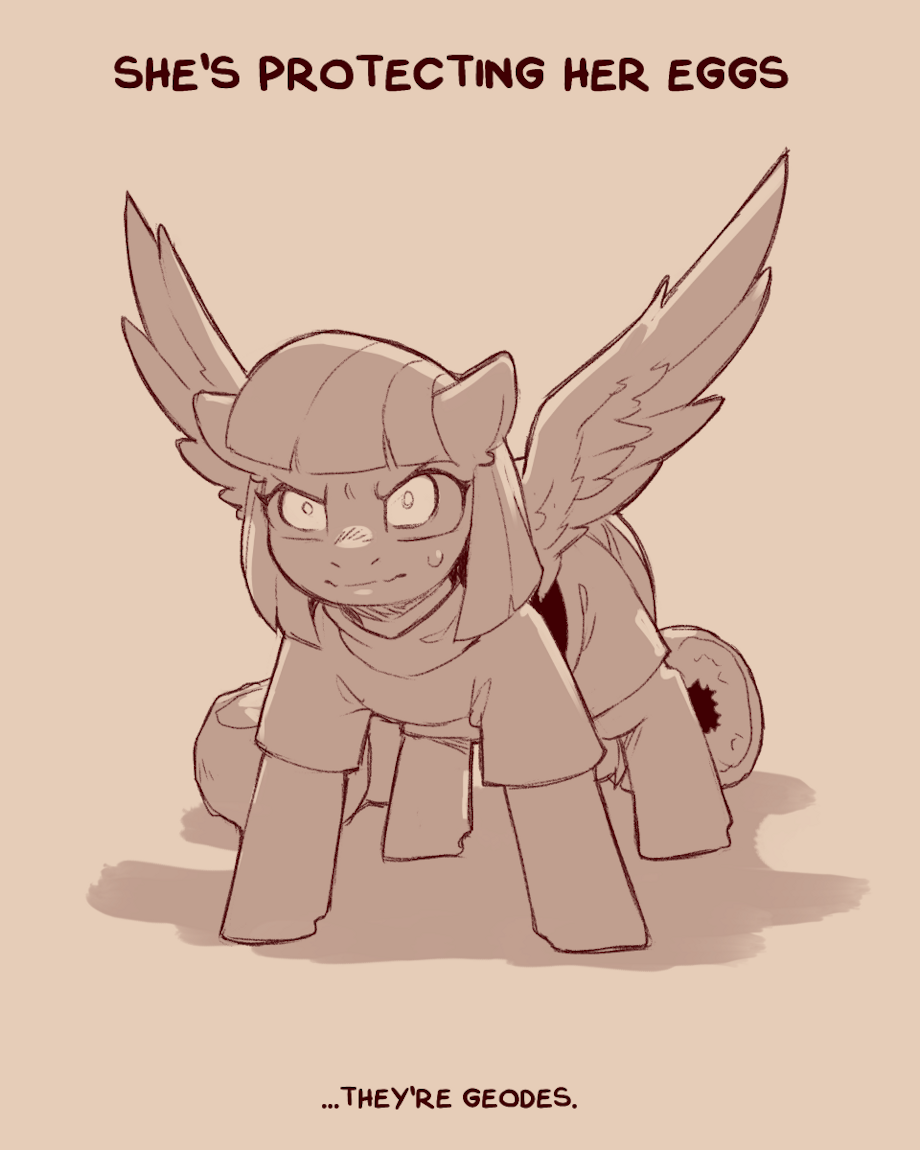 One day they'll hatch (no they won't). And here we have the Pegasi of rocks notice it protects its precious geodes from intruders and predators such as miners and those guys who smash geos for no apparent reason her wings in an uphead position as a defensive warning to anyone nearby additionally her skiffing sound when she produces other nose is an indication of a predatorial defense additionally it will spit at its opponent as a warning sign to fuck off If this fails it will be the living crap out of it from the air similar to how an eagle attacks its prey this has been pony biology 101 stay tuned next week for zebra biology and Griffin mating habits