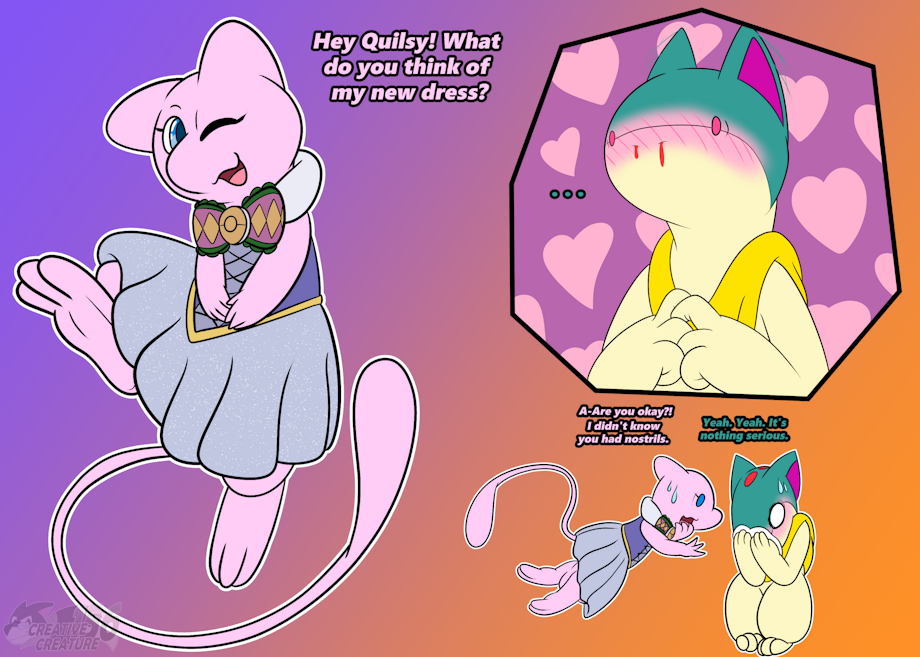 I remember seeing Mew getting a cute as heck costume from Pokemon Unite, so I put Mewny in it. I think Quilsy likes it too! ;3